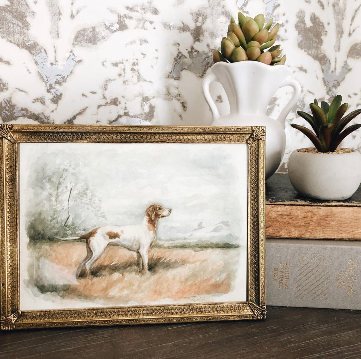 "This sweet little English Pointer watercolor is a perfect addition to my family room bookcase. "